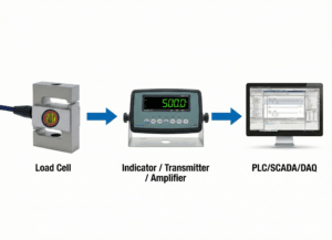 Typical signal chain: load cell → conditioner/indicator/transmitter → PLC/SCADA/DAQ.