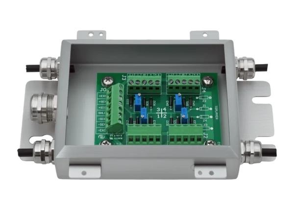 Our AJB-015 is a 4 channel load cell summing card housed in an Stainless Steel enclosure. Trimming of signal output is accomplished with multi-turn trim pots.