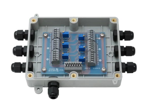 Our JB-FI is a load cell summing card housed in an ABS enclosure. It has six 5-position terminal strips for load cell input and one 7-position terminal strip with internally jumped sense terminals for output to the instrument. The board will sum 2 to 6 load cells and can be daisy-chained to sum up to 12 load cells using 2 summing cards and enclosures. Trimming of signal output is accomplished with six multi-turn trim pots.
