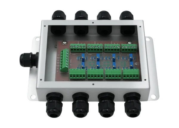 Our JB-SS-8 is a 8 channel load cell summing card housed in an Stainless Steel enclosure. Trimming of signal output is accomplished with multi-turn trim pots.